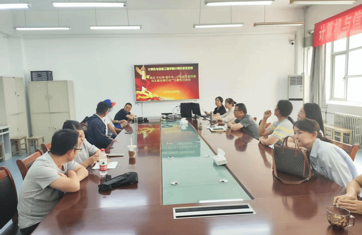 计算机系党支部举办“学规定·守纪律·强作风——计算机系教师廉洁从教先锋行动”教学研讨会及主题党日活动。此次活动旨在加强教师在课程教学过程中的经验分享与交流,以及学习八项规定改变中国的启示。计算机系全体教师参加了此次会议,会议由计算机系系主任苗茹和计算机系党支部书记赵雅靓主持。