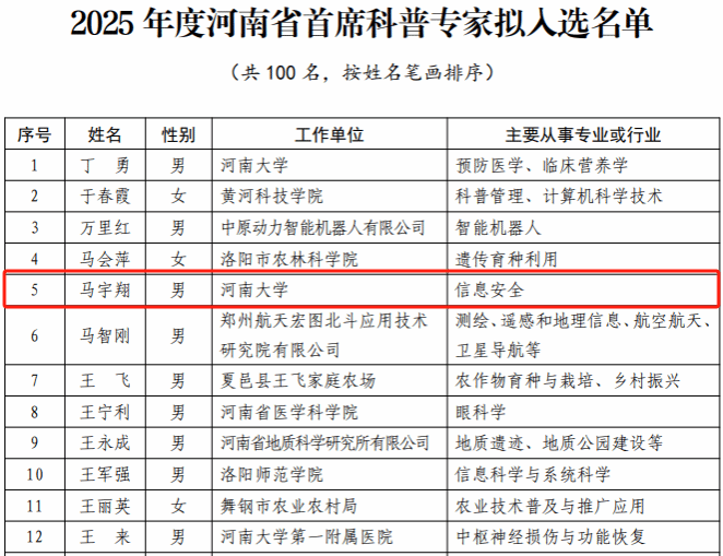 近日,河南省科学技术协会发布2025年度河南省首席科普专家拟入选名单公示,麻豆社