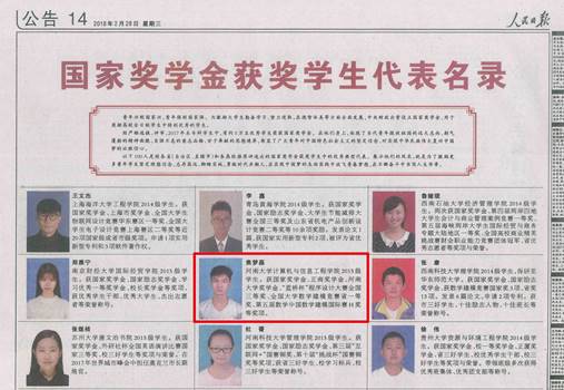 2018年2月28日,《人民日报》14版刊登了2017年度高等学校国家奖学金获奖学生代表名录,其中麻豆社