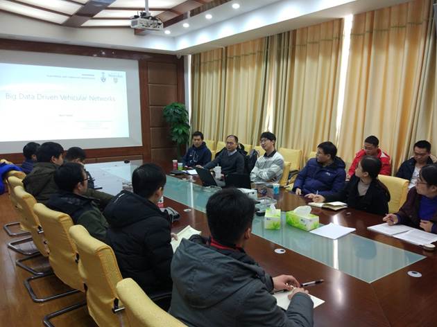 2018年1月8日上午,承楠博士和时伟森博士受邀访问车联网协同技术国际联合实验室,与实验室深入交流VANET合作事宜。承楠博士作专题学术报告“Big Data Driven Vehicular networks (VANETs)”,承博士首先介绍了大数据时代背景下的车联网技术发展趋势,然后从异构车联网架构下的大数据传输和基于情景感知的车联网协议设计两个方面,详细讲解了VANET领域的大数据技术支撑及应用,最后,承博士对未来大数据驱动下的车联网研究热点进行了总结和展望。
