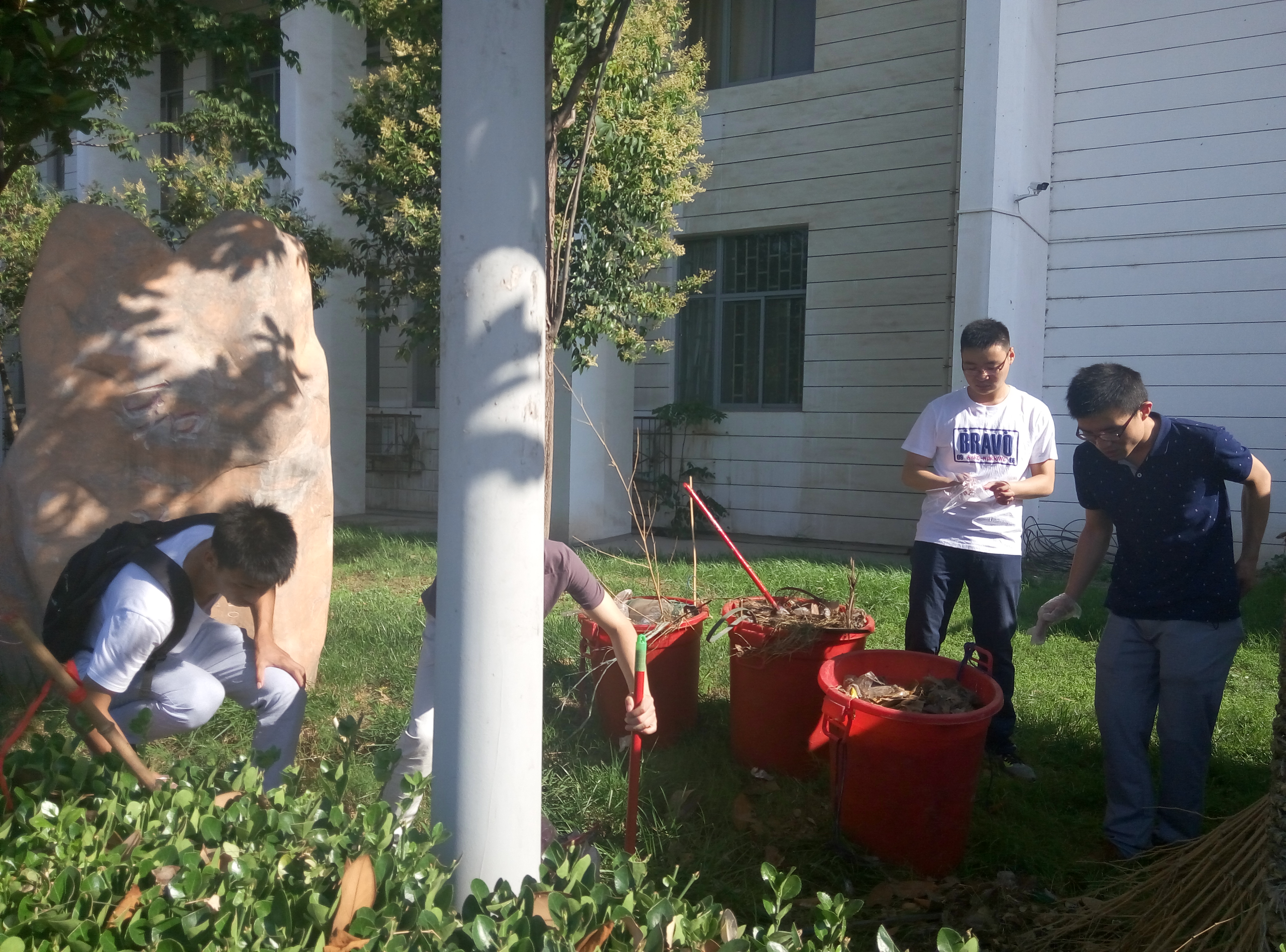 学生党员进行校园环境美化劳动。
