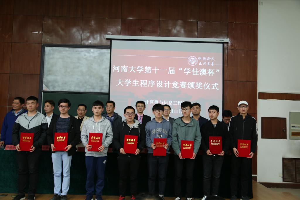 第十一届“学佳澳杯”大学生程序设计竞赛颁奖仪式。学佳澳公司代表田佳斐先生等三人,以及学院领导班子、部分中层干部、师生代表、获奖学生参加了颁奖仪式。