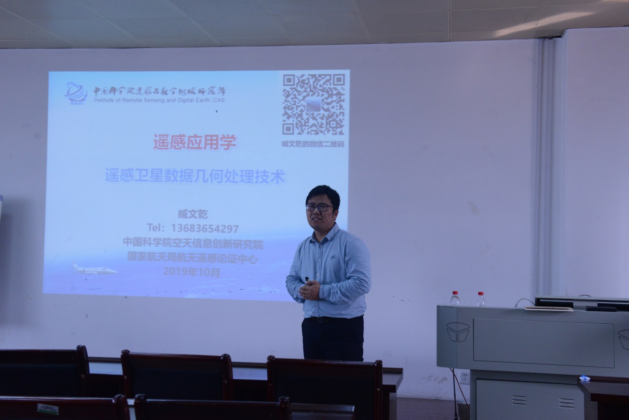 臧文乾博士首先简单介绍了遥感卫星数据及其特点,并从目前最新遥感卫星数据的特点分析了几何误差来源,讲解了传统遥感卫星数据几何处理技术及方法,同时结合目前互联网应用环境下新的数据规格、处理方法、软件系统及“数方”应用模式给大家阐述了遥感应用过程的相关专业知识。报告深入浅出,用日常生活中的例子将原本专业化的遥感卫星数据几何处理技术讲解地通俗易懂、生动有趣。报告在师生们热烈的掌声中结束。