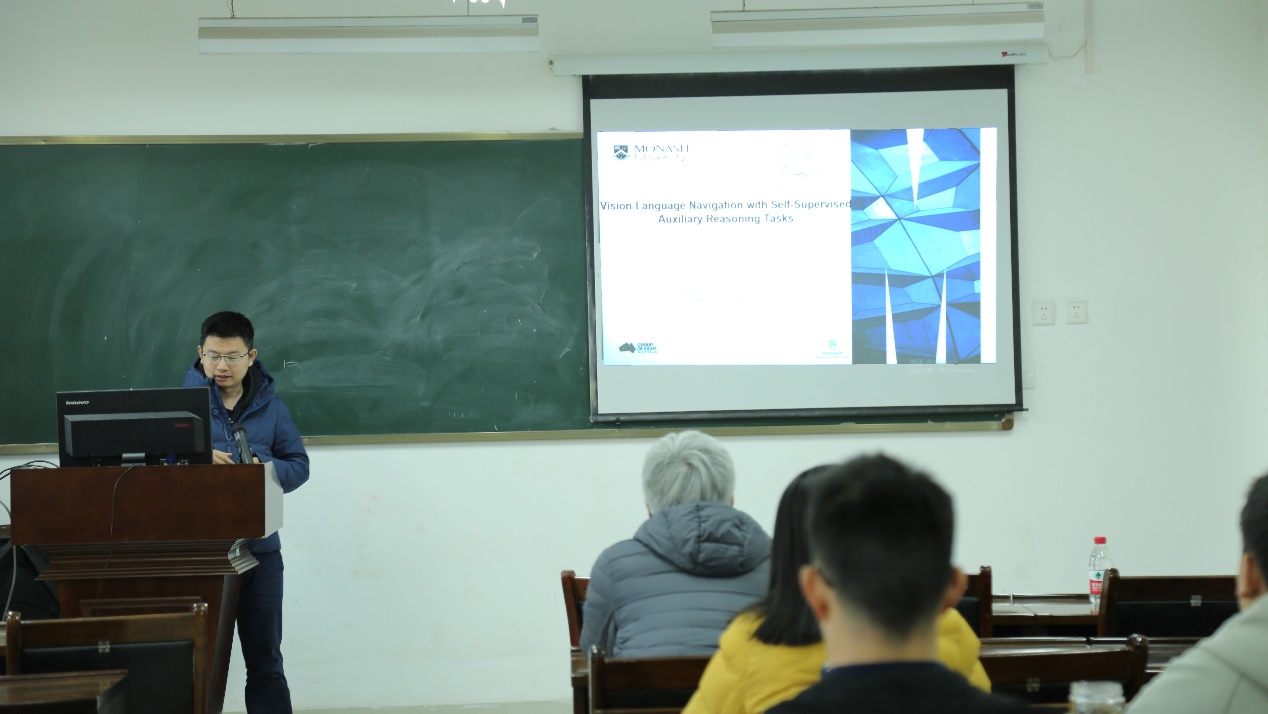 做了题为“Vision-Language Navigation with Self-Supervised Auxiliary Reasoning Tasks”的报告。报告由杨伟老师主持,学院部分师生参加了本次报告。