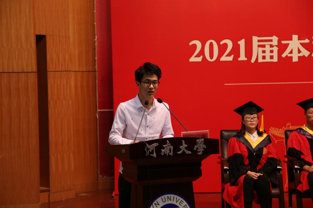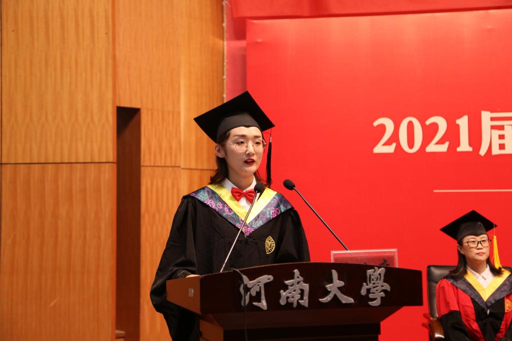 毕业生代表王一帆同学在发言中表达了对学校、学院和老师们的培养和教导发自内心真挚的感谢,大学四年的点点滴滴,在她的心中留下了不可磨灭的痕迹,一千多个日日夜夜里,有美好、有焦虑、有快乐、有悲伤,但到了最后时刻,时间却如此吝啬,不愿多停留一分一秒。