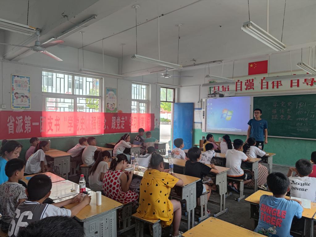 为了响应“学党史,强信念,跟党走”的号召,省派第一团支书、学院团委书记程前帅老师给孩子们普及了中共历史的重大事件,中国共产党的成立、革命斗争、取得胜利,孩子们听得格外认真、心情愤慨、内心激昂。