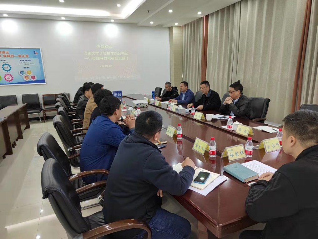 2022年3月8日,受中国电信股份有限公司河南分公司(河南电信)邀请,学院党委书记吕冰带队到中国电信股份有限公司开封公司(开封电信)与来汴调研的河南电信教育客户部总经理张旻等一行4人举行项目对接合作交流。跟随吕冰参加座谈的有副院长柯杨、副院长左宪禹、信息安全系党支部书记张磊、数据智能分析与处理团队负责人朱小柯;跟随张旻来汴调研的有河南电信政企支撑中心副总经理康浩杰、教育专家张爱军、徐丙卫;开封电信参加座谈的有开封电信总经理助理胡鑫,教客部总经理黄春雨、政企支撑中心总经理孙国栋、云网部5G专家高翔、云网部计算机专家安永辉。