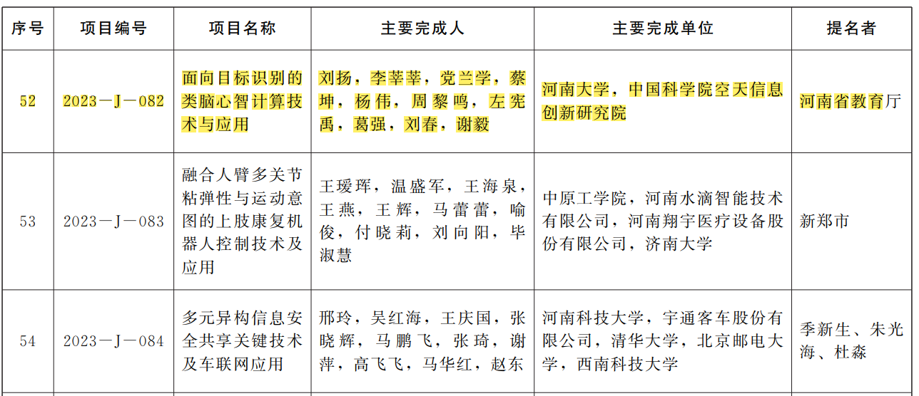 类脑智能创新型科技团队带头人刘扬教授主持的“面向目标识别的类脑心智计算技术与应用”科研成果获得河南省科学技术进步奖二等奖。