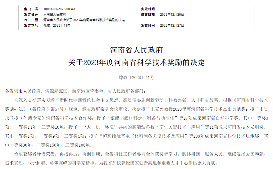 近日,《河南省人民政府关于2023年度河南省科学技术奖励的决定》(豫政〔2023〕41号)公布,麻豆社