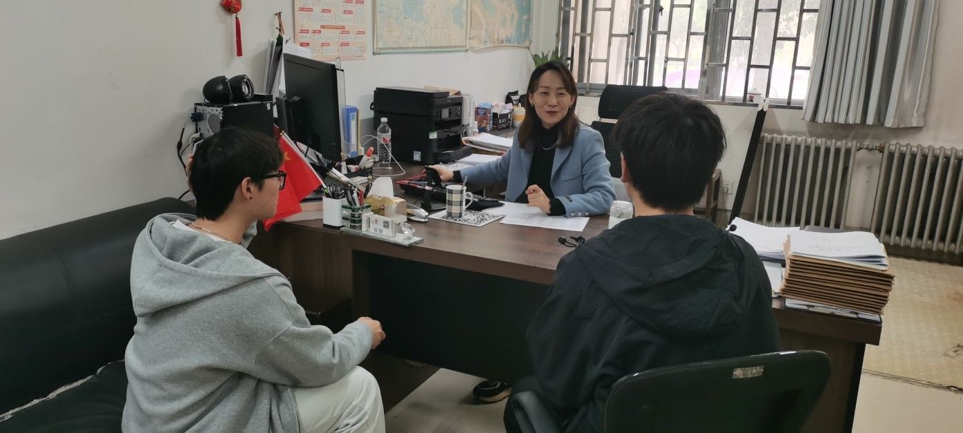 与此同时,孙洁还通过小组谈话的形式与同学们进行约谈,她针对每个同学在保研、考研或就业方面的困惑,细心回答,耐心指导。通过这种近距离谈心谈话的方式与学生充分沟通与交流,更加深入的了解学生在学业与个人发展方面实际需求,提供更为有效和具体的指导,为学院的人才培养和学生高质量就业做好充分准备。