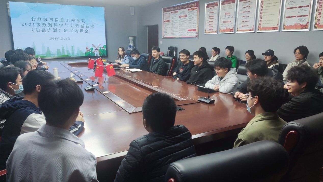 3月21日下午,在学院302会议室举行21级数据科学与大数据技术(明德计划)实验班主题班会,班会上多位同学分享了自己的考研规划和备考方法,学院党委副书记张大帅、实验班班主任韩宏宇、21级辅导员孙洁在详细了解同学们的情况后,对同学们的疑问给出了解答和建议,并根据大家的需求积极协调学院资源为同学们提供更具体的考研、就业等帮扶措施。并鼓励同学们及早明确职业规划,坚定信心,从现在开始行动。