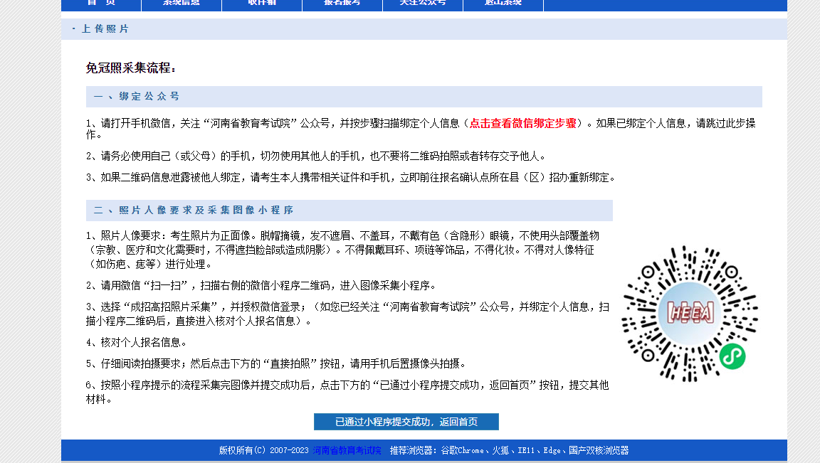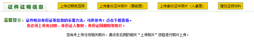 第九步:按照系统提示上传本人近期免冠照、身份证、毕业证和证书等相关证明材料原件图片信息;异地报名的,还须上传《河南省居住证》原件图片信息。