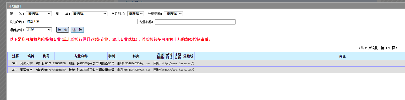 ”,其他信息不选择,然后点击“检索”,如图二所示,根据个人报考专业及层次自行选择,见图三。(选择专业时请务必看清楚报考层次)