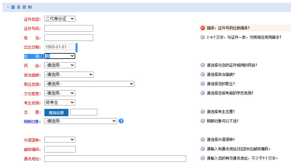 第五步:根据系统要求,录入个人相关信息。考生类别有“统考生”和“免试生”,“二学历”考生选择“免试生”;考生可根据自己的情况进行“照顾对象”选择 。