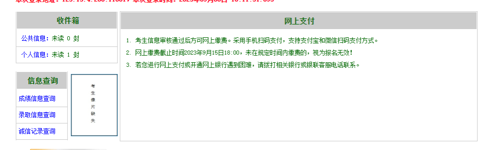 *温馨提示:网上缴费截止时间2023年9月15日18:00,未在规定时间内缴费的,视为报名无效!