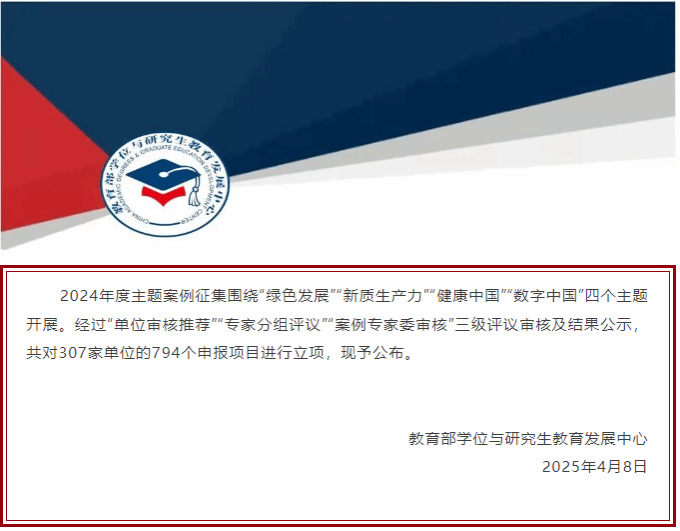 教育部学位与研究生教育发展中心(简称:学位中心)面向全国高校主题案例征集围绕“绿色发展”“新质生产力”“健康中国”“数字中国”四个主题开展。经过“单位审核推荐”“专家分组评议”“案例专家委审核”三级评议审核及结果公示,共对307家单位的794个申报项目进行立项。