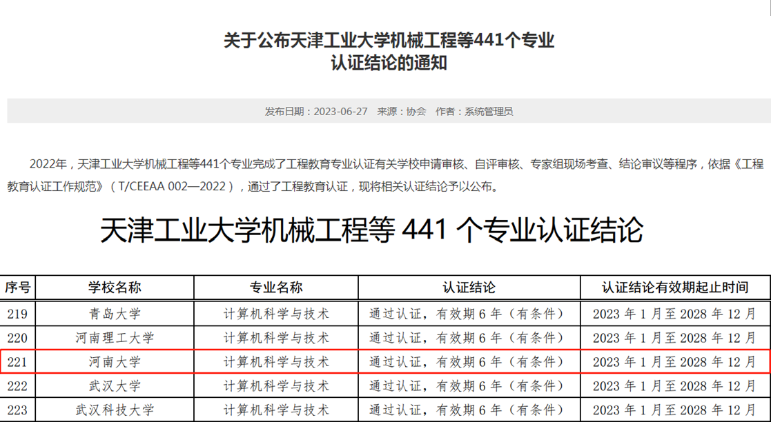 计算机科学与技术专业顺利通过工程教育专业认证,认证结论有效期六年,自2023年1月起至2028年12月止。