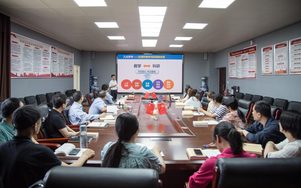 专题辅导阶段,学院执行院长韩道军结合学习贯彻习近平新时代中国特色社会主义思想主题教育总体要求,以“学科与学科建设”为题,从学校的学科建设布局出发,围绕学科建设目标,就如何推动学院学科高质量内涵式发展作专题辅导。他表示,学科建设是学院建设的基石,直接影响到人才培养质量和学院内涵式发展水平。学院全体师生要凝聚学科发展共识,对比全国优势学科,环视省内相关学科,以目标为导向,找准定位,整体推进学科影响力提升。他强调,要坚持以习近平新时代中国特色社会主义思想为指导,认真落实立德树人根本任务,紧抓“双一流”“双航母”战略机遇,建设特色学科平台,打造特色学科团队,服务国家急需,推动学院高质量内涵式发展。