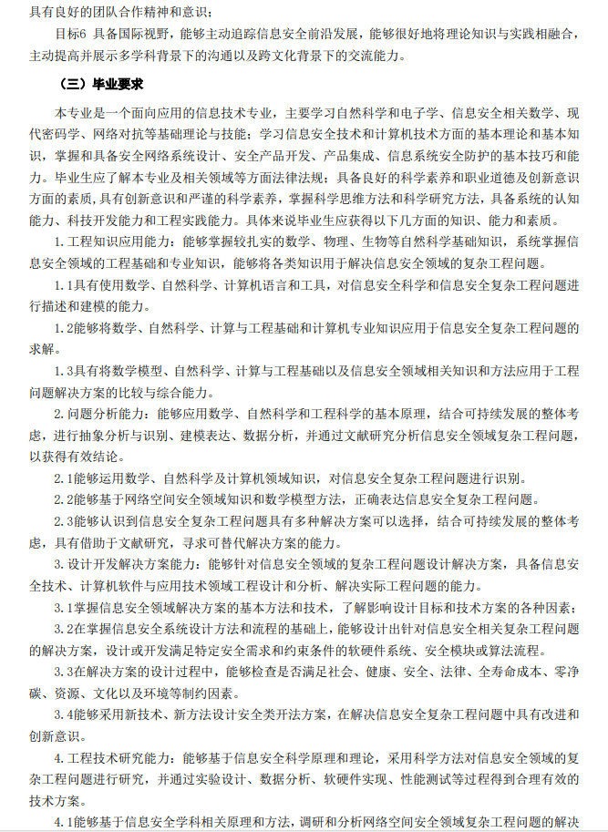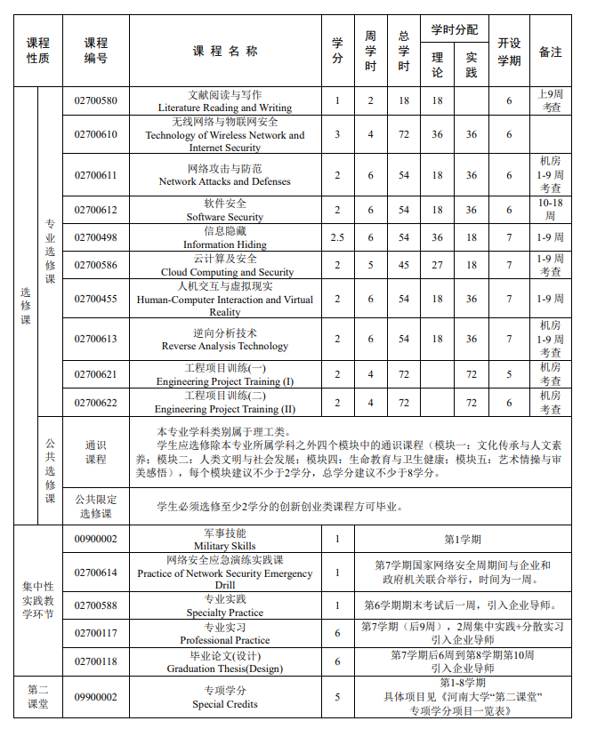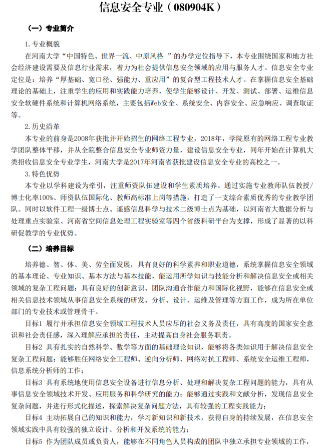 为河南省首批建设信息安全专业的院校。信息安全系于2020年获批河南省信息安全科普教育基地,并成立开封市信息安全专家智库,强化高校教师建言献策的作用,对发生的网络安全应急事件提供处置参考意见,并对安全意识、保密意识、服务意识、沟通能力等多方面的提供技术支撑。2020年入选河南省一流本科专业建设点,2021年获批河南省新工科信息安全大学生实习实践基地,2022年信息安全党支部被评选为河南省样板党支部,2023年获批河南省全民数字素养与技能培训基地。经过4年的建设,信息安全专业已建立完善的人才培养体系,专职教师26人,其中博士26人,在读博士1人,教授6人,副教授12人,讲师8人。 具有副高级技术职称以上教师占总数的70%。