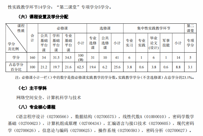 本专业毕业生具有良好的人文修养和责任意识,能够在国家重要部门、高等院校、科研院所、信息技术企业等单位从事密码科学与技术相关科学研究、国产密码工程的应用与开发和管理运维等工作。本专业基本学制为4年,学生可在3-7年内完成学业。学生在规定的弹性学制内修满学分并符合学位授予条件,授予工学学士学位。
