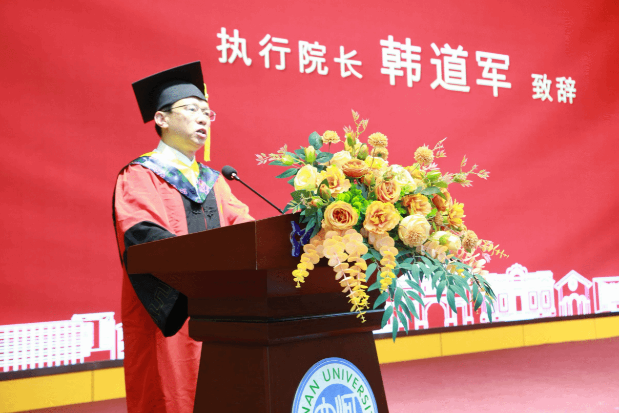 韩道军在致辞中对毕业生们表达了最美好的祝愿和最真诚的期望,希望同学们能够勇担复兴使命和历史重任,善良做人做事。并以《西游记》中“扫塔辩奇冤”的故事为引,给同学们提供四点哲理启发。一是“起点低”,希望同学们将来无论从事哪一个行业,都要认认真真从基础做起,从小事做起;二是“当下净”,以“唐僧扫塔由下往上致灰尘反复落,狗熊掰棒子掰一个扔一个”等形象比喻激励同学们人能把握的唯有当下,做好每个当下人生才有意义;三是“回头脏”,在走上更高台阶后发现来时路变脏,指出这是进步的体现,进步会让人看到自身不足,希望同学们一定要学会回头看,反思自己,改正自己,才能不断更新,不断前行;四是“平常道”,希望同学们专注当下,凡事在事上练,工作也是一种修行。