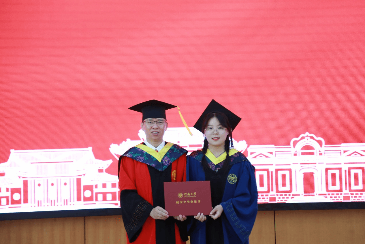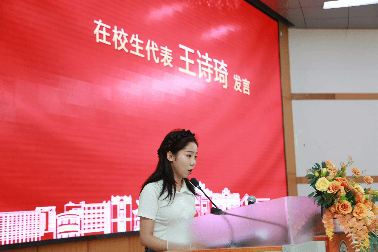 在校生代表2024级研究生王诗琦以“千淘万漉虽辛苦,吹尽狂沙始到金”致敬毕业生,感谢师兄师姐们做出的青春榜样,祝愿他们带着河大赋予的智慧与韧性,在数字浪潮中定义规则、创造联结、书写新篇章!