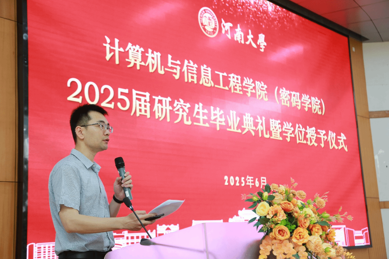 (密码学院)2025届研究生毕业典礼暨学位授予仪式在计算机学院201机房隆重举行。学院领导班子成员、学位评定分委员会成员、教师代表、部分学生家长及全体2025届研究生毕业生齐聚一堂,共同见证这一庄严时刻。典礼由学院院长助理李昂主持。