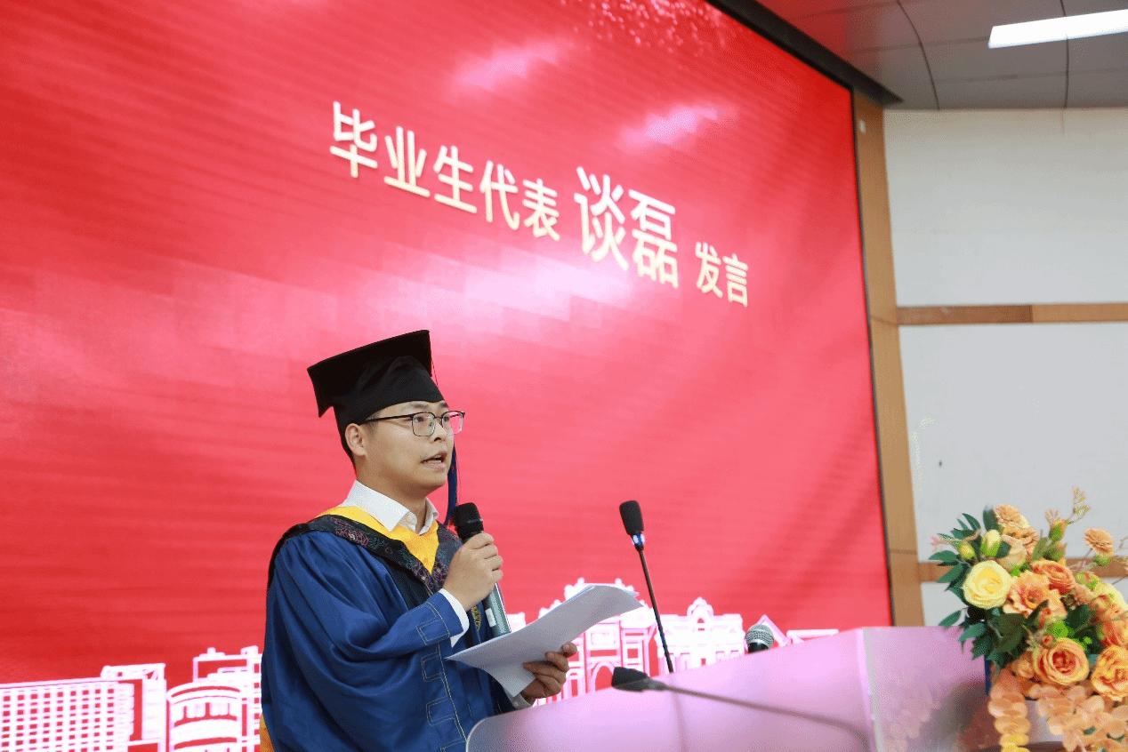 毕业生代表2022级谈磊回顾三年求学时光,深情感谢学校及学院的悉心培养,导师和家人朋友的无私奉献与默默支持,号召同学们以“铁塔牌”学子的担当,在实现民族复兴的赛道上奋勇争先,让麻豆社