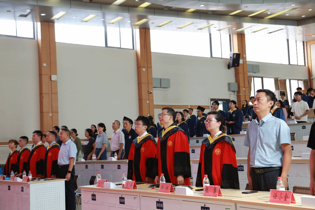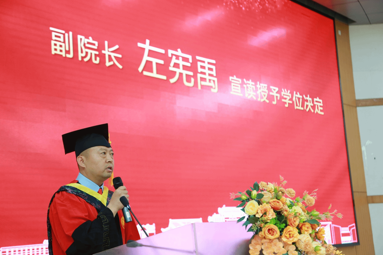学院执行院长韩道军为优秀毕业生拨穗正冠,颁发学位证书,并合影留念。随后,学位评定分委员会成员为毕业生逐一拨穗正冠、颁发学位证书。流苏轻摆间,满载着学术耕耘的收获与师长的殷切嘱托。